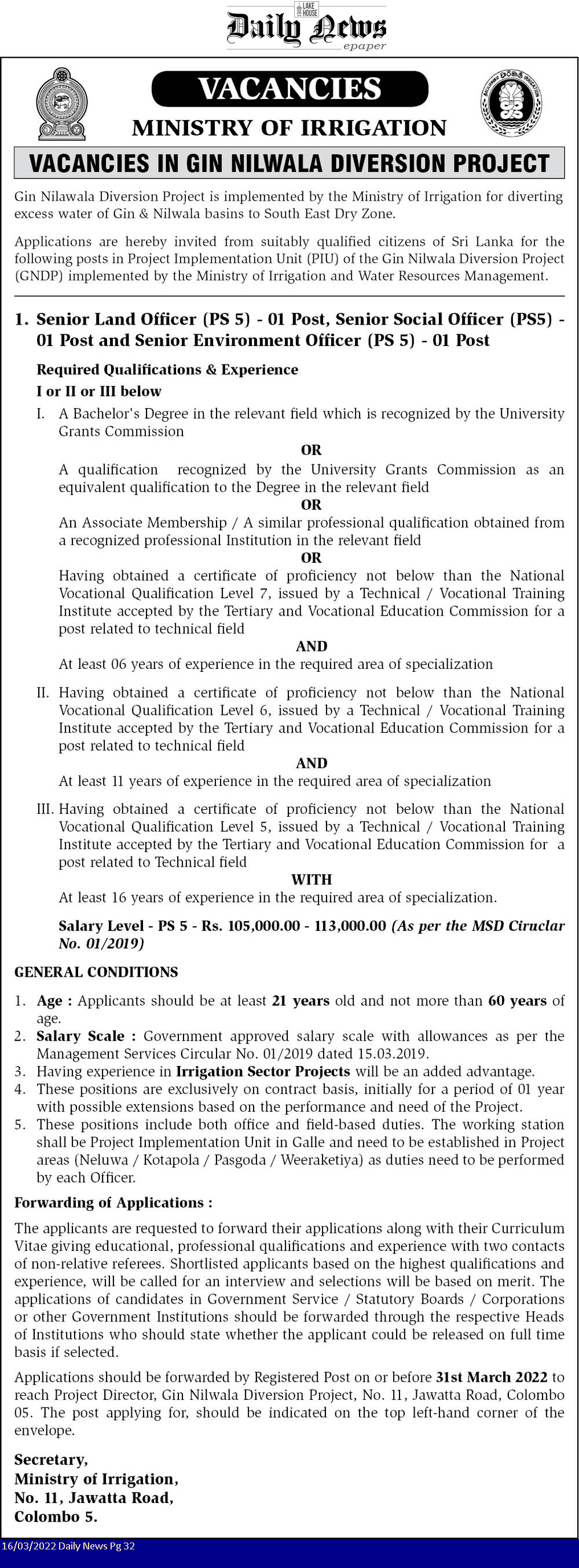 Senior Land Officer, Senior Social Officer, Senior Environmental Officer - Ministry of Irrigation