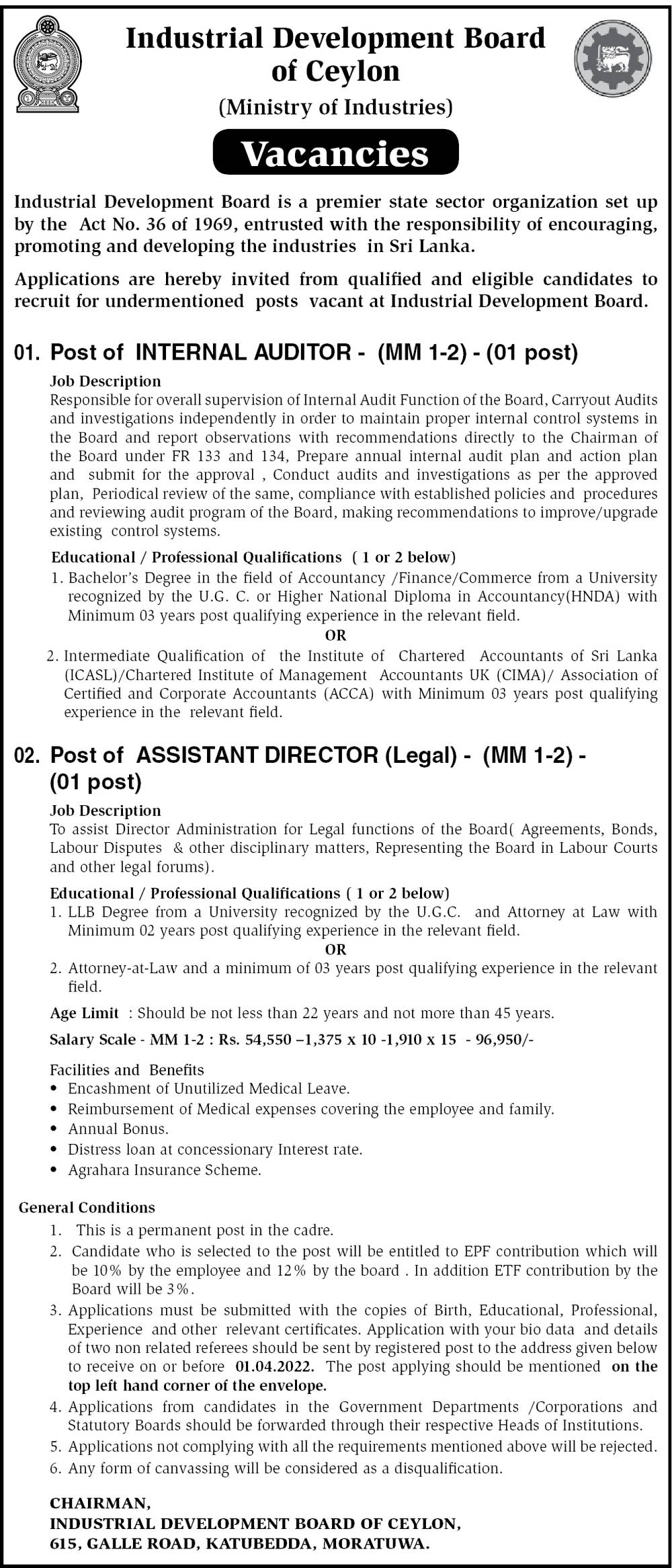 Internal Auditor, Assistant Director - Industrial Development Board of Ceylon