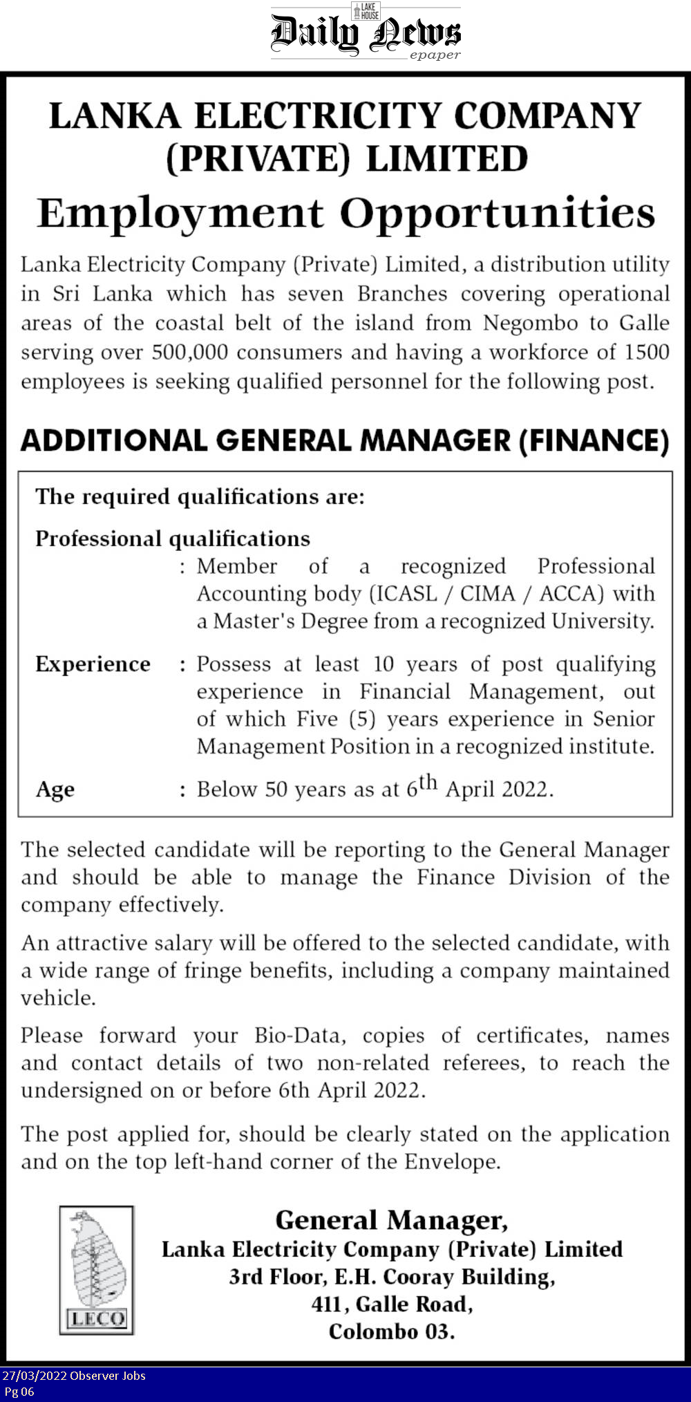 Additional General Manager - Lanka Electricity Company (Private) Ltd