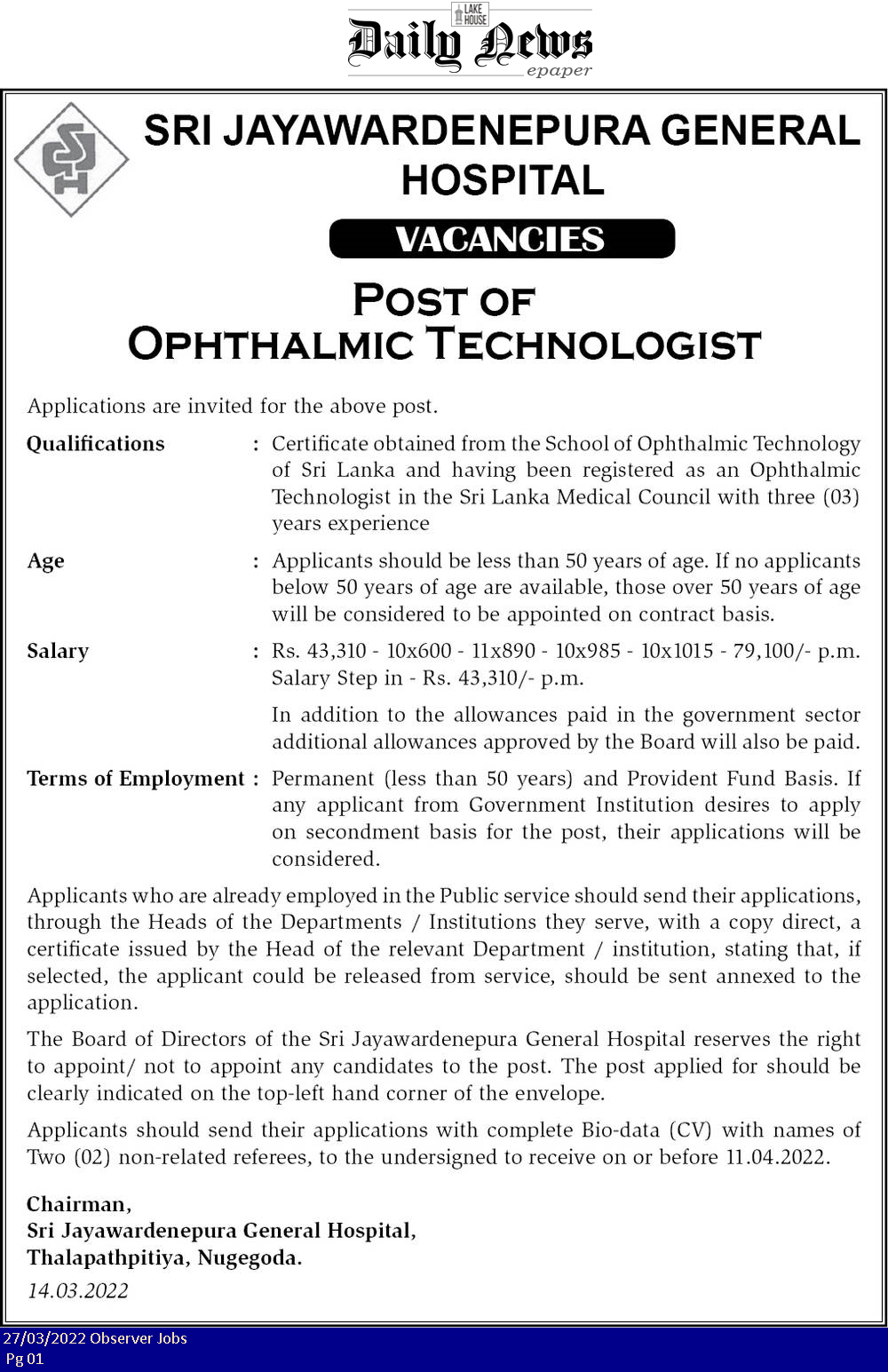 Ophthalmic Technologist - Sri Jayewardenepura General Hospital