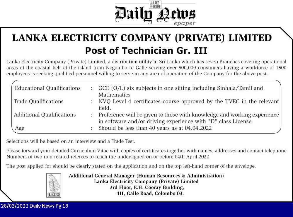 Technician – Lanka Electricity Company (Private) Limited (LECO)