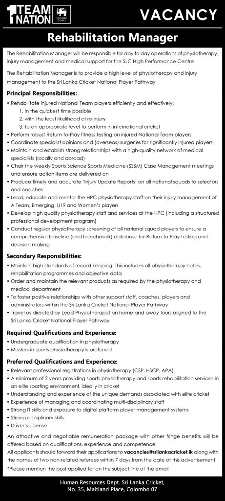 Rehabilitation Manager - Sri Lanka Cricket
