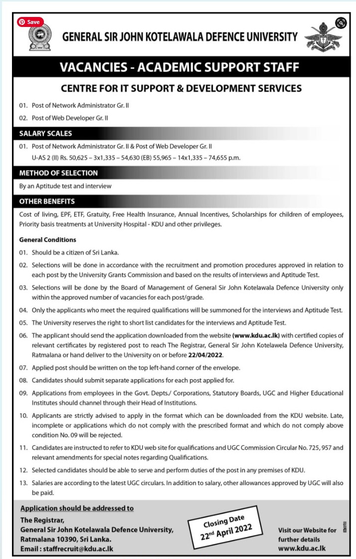 Network Administrator, Web Developer - General Sir John Kotelawala Defence University
