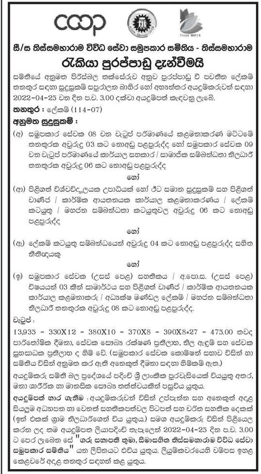 Secretary - Tissamaharama Multi Purpose Co-operative Society