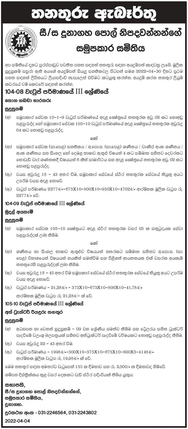 Warehouse Trustee, Cashier, Hand Tractor Driver - Dunagaha Coconut Producers' Co-operative Society Ltd