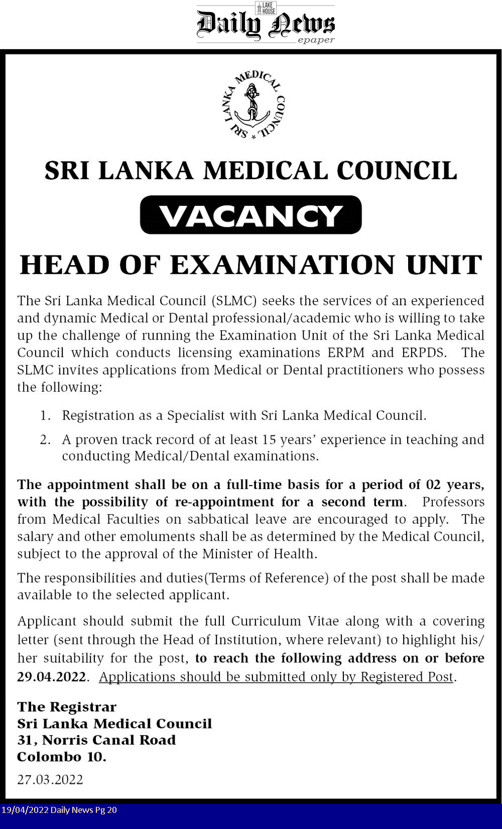 Head of Examination Unit - Sri Lanka Medical Council