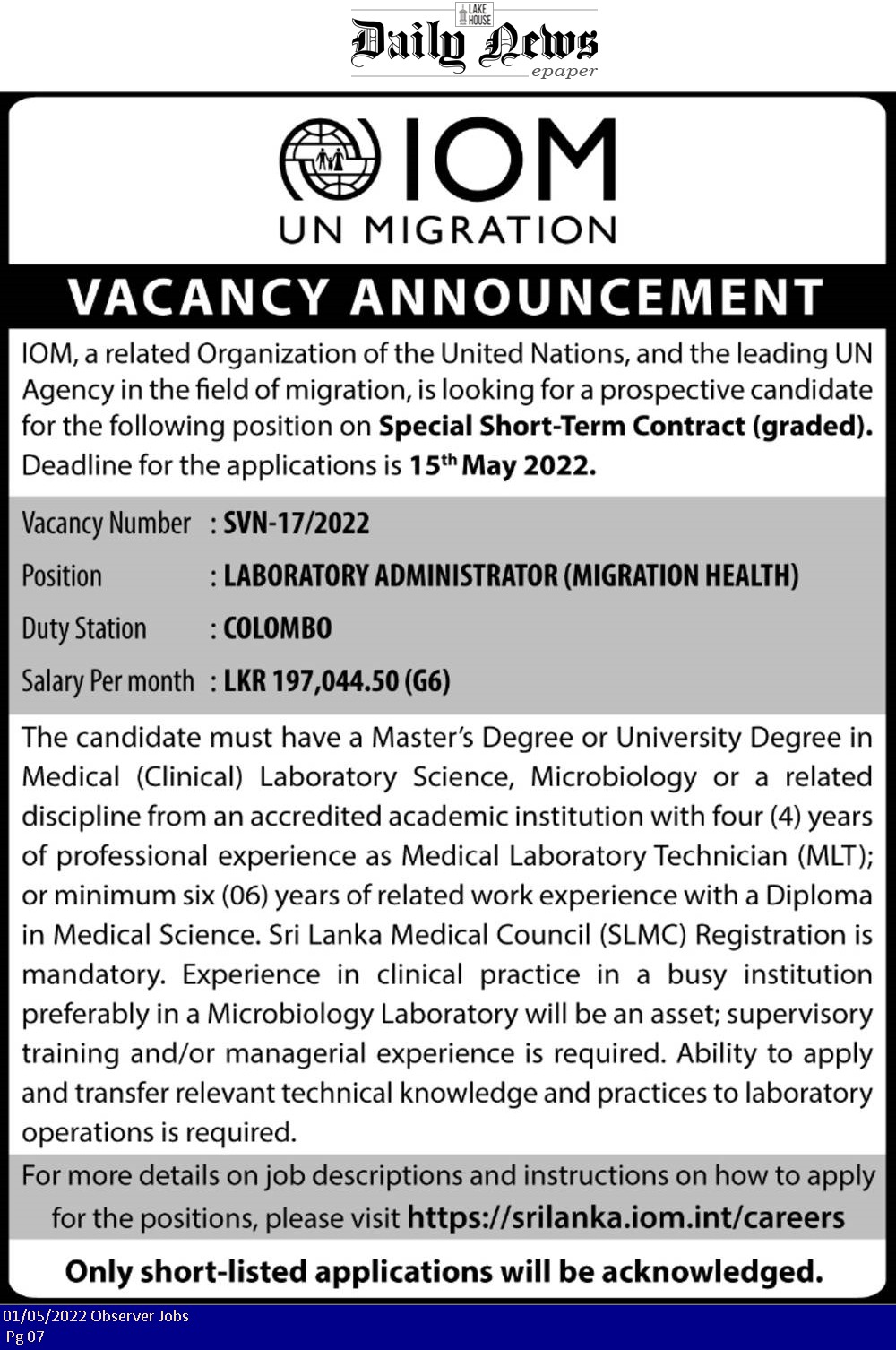 Laboratory Administrator - International Organization for Migration