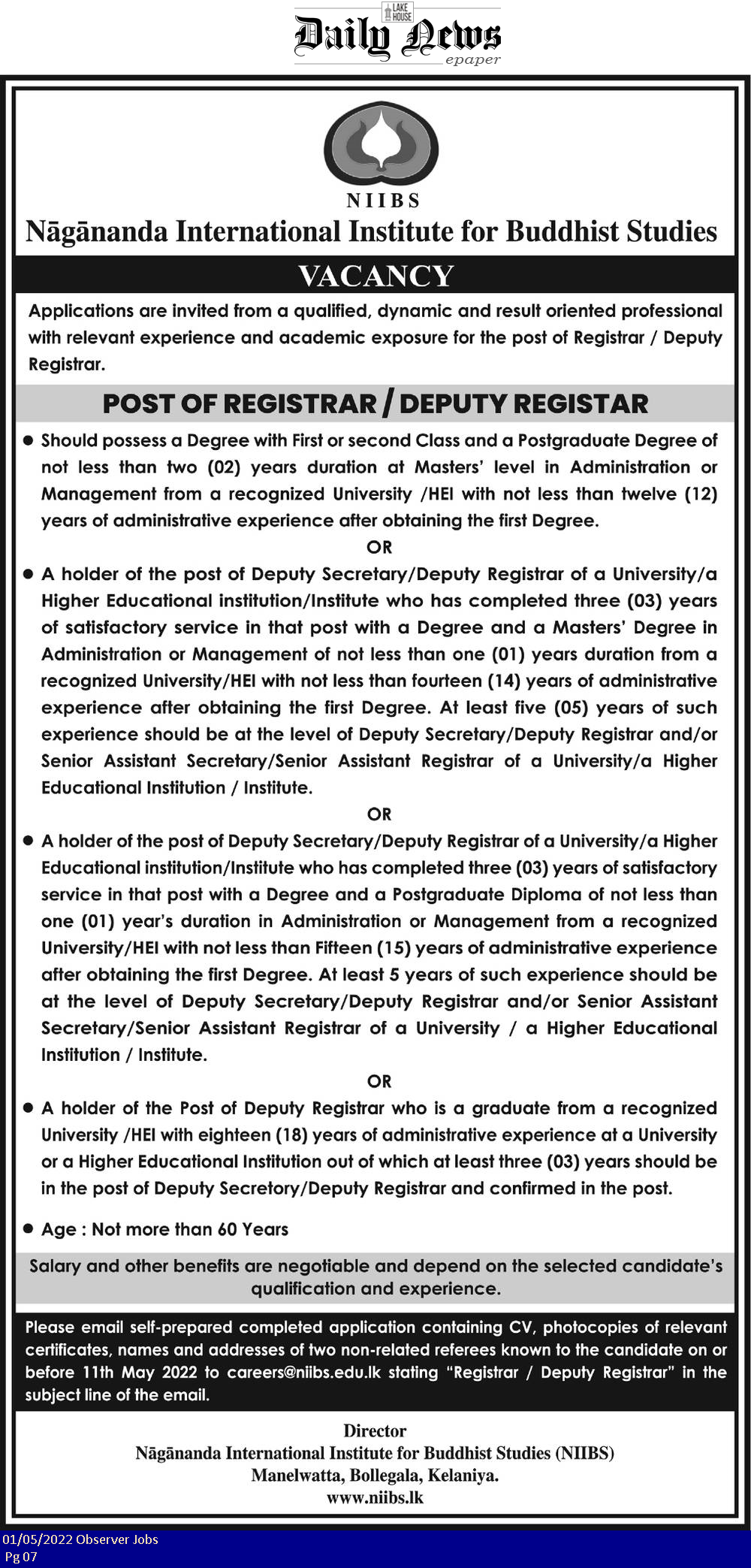 Registrar, Deputy Registrar - Nagananda International Institute for Buddhist Studies