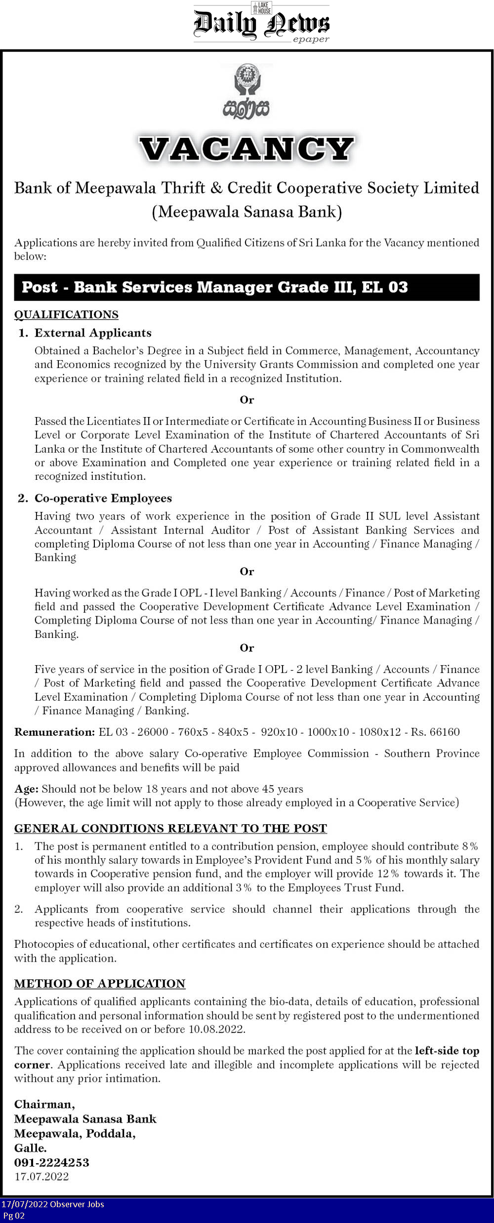 Bank Service Manager - Meepawala Sanasa Bank