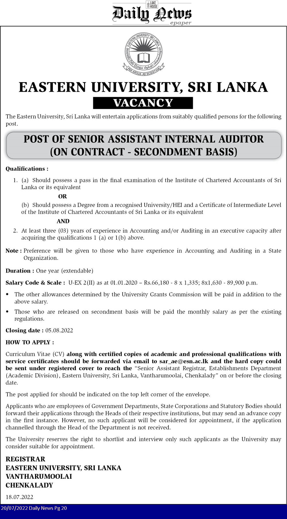 Senior Assistant Internal Auditor - Eastern University