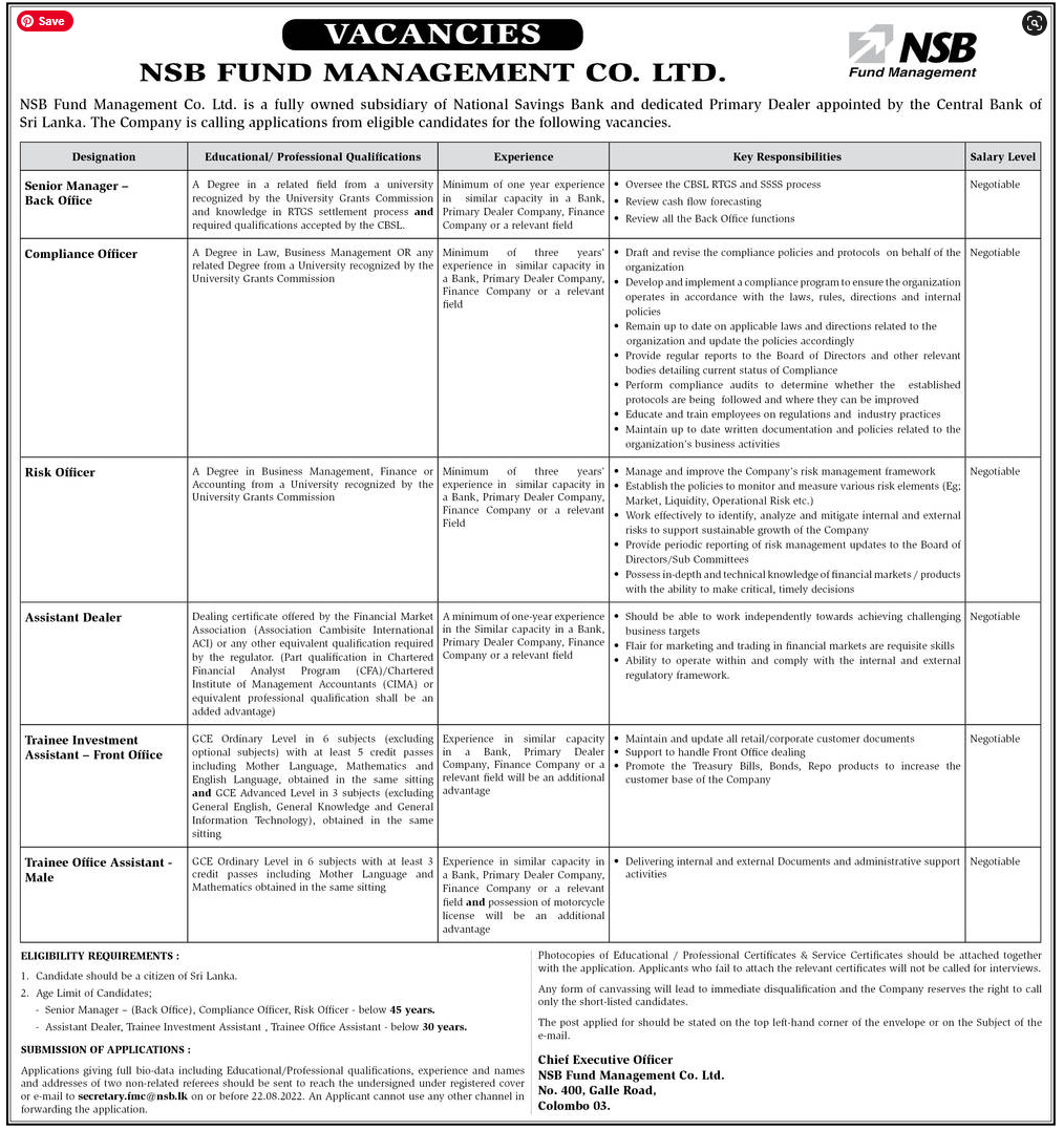 Senior Manager, Compliance Officer, Risk Officer - NSB Fund Management Co. Ltd