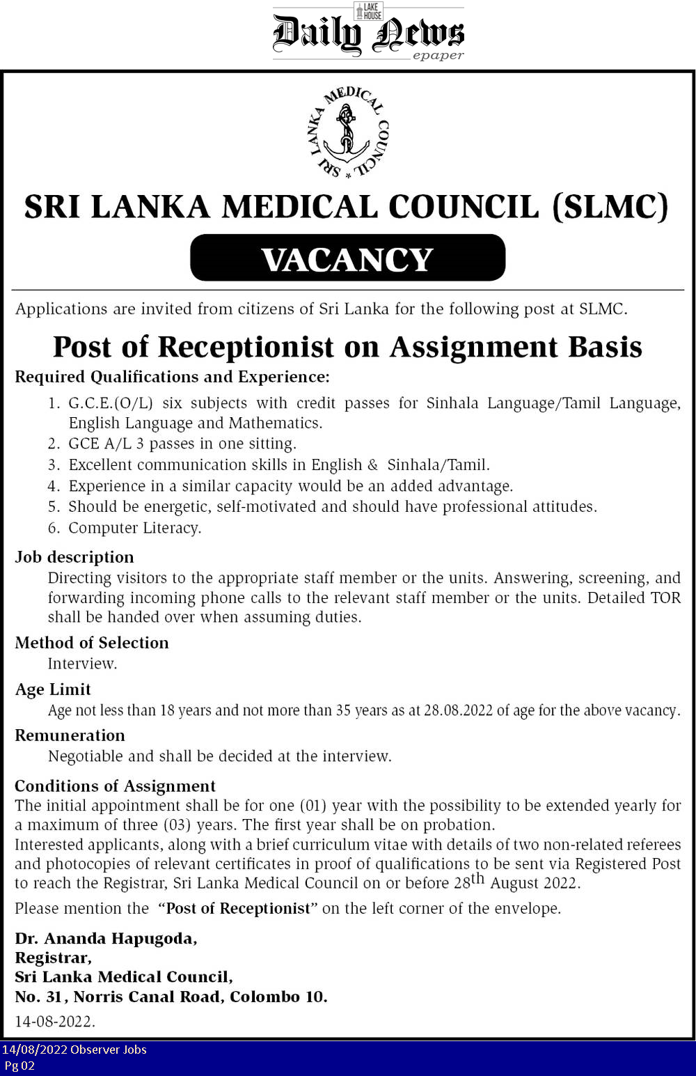 Receptionist - Sri Lanka Medical Council