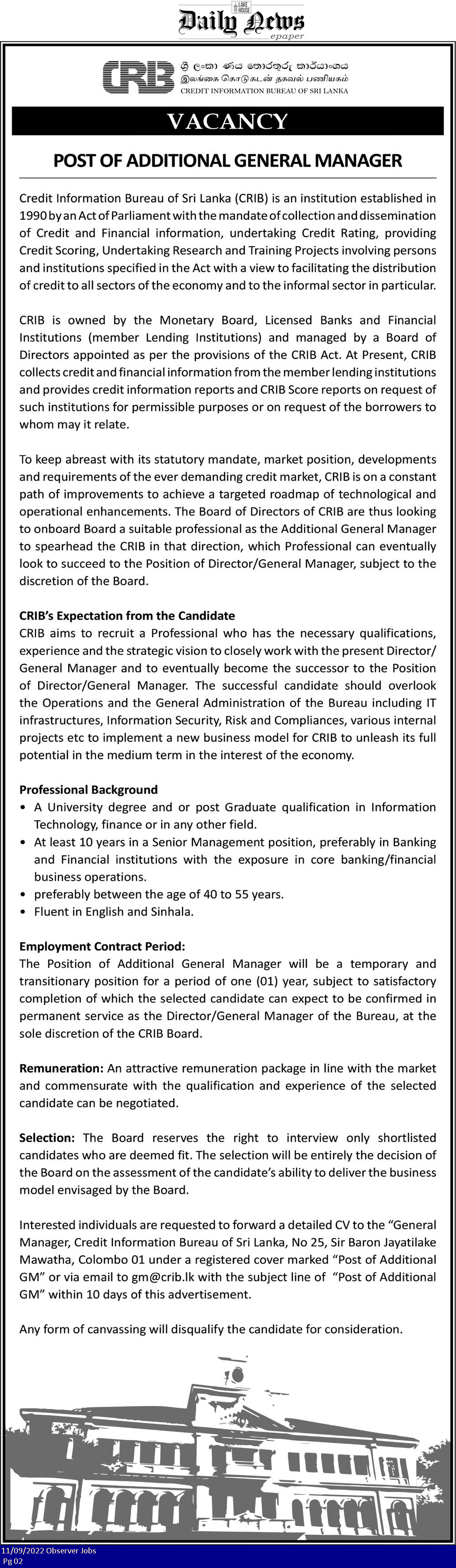 Additional General Manager - Credit Information Bureau of Sri Lanka