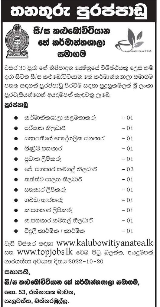 Factory Manager, Administrative Officer - Kalubowitiyana Tea Factory Ltd