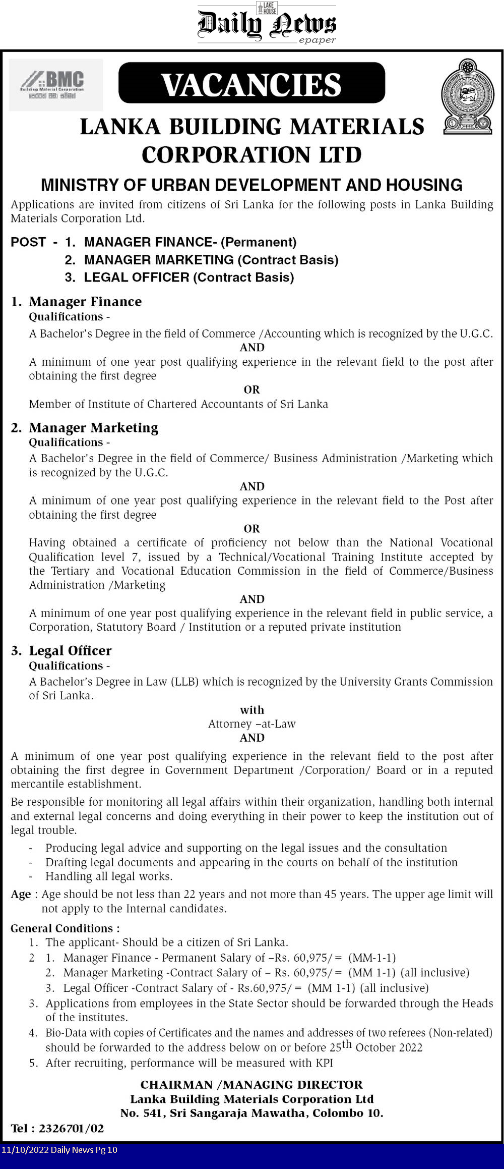 Finance Manager, Marketing Manager, Legal Officer - Lanka Building Materials Corporation Limited