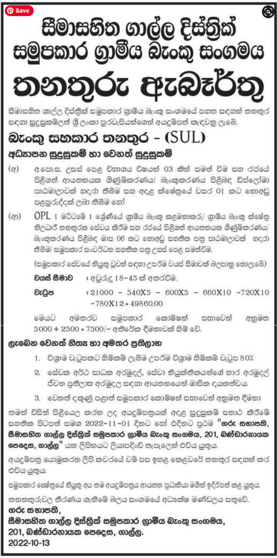 Banking Assistant - Galle District Co-operative Rural Banking Association Limited