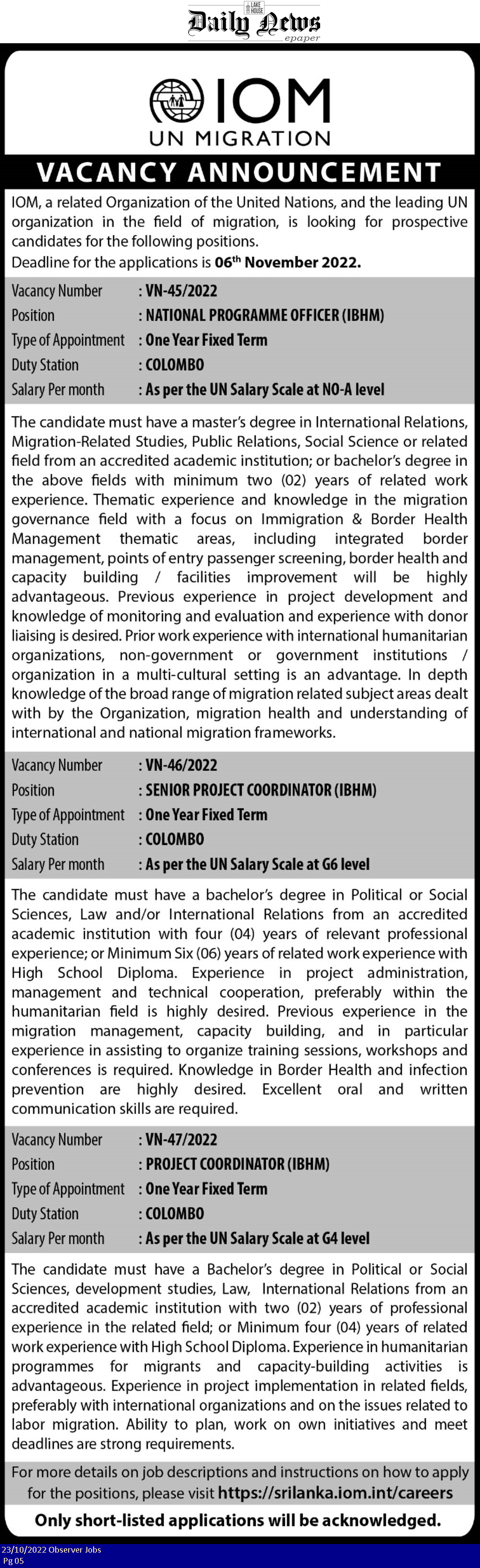 National Programme Officer, Senior Project Coordinator - International Organization for Migration