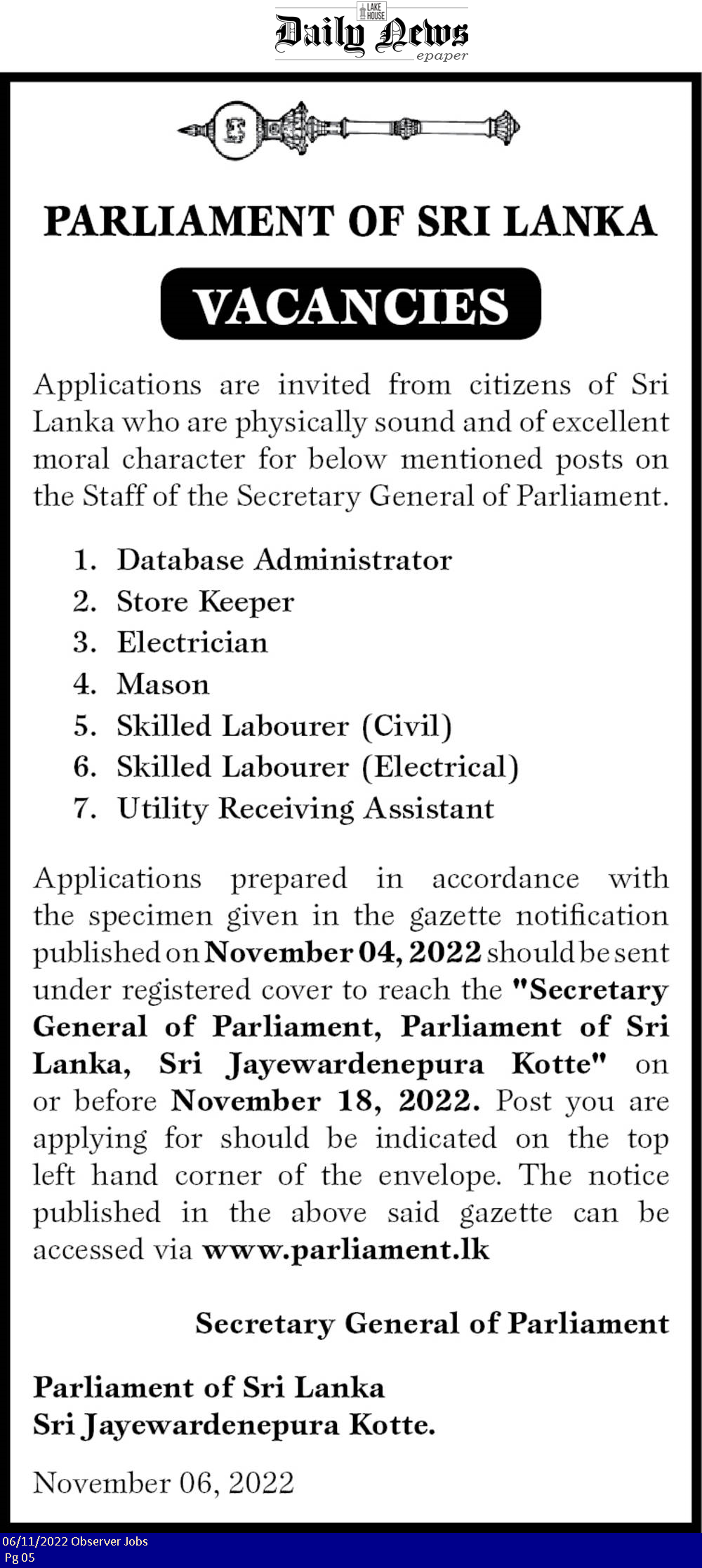 Database Controller, Store Keeper, Electrician - Parliament of Sri Lanka