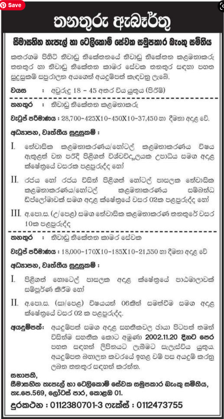 Resort Manager, Resort Room Attendant - Post & Telecom Employees' Co-operative Bank Society Ltd