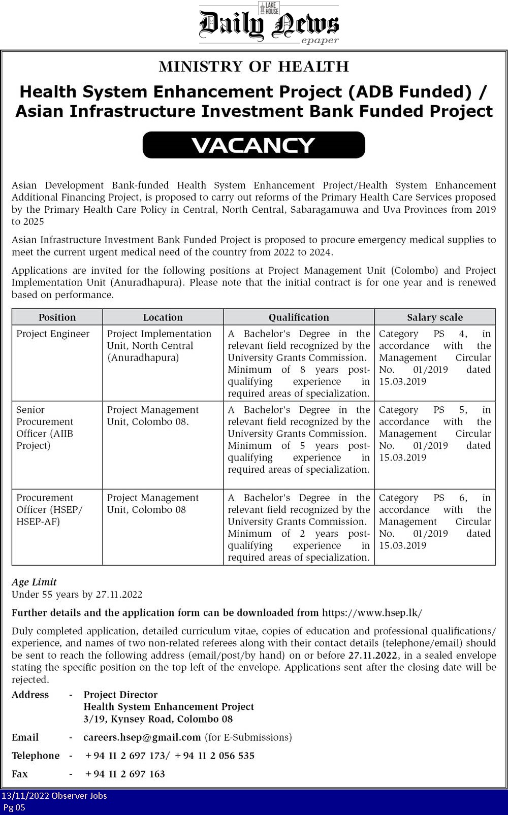 Project Engineer, Senior Procurement Officer, Procurement Officer - Ministry of Health