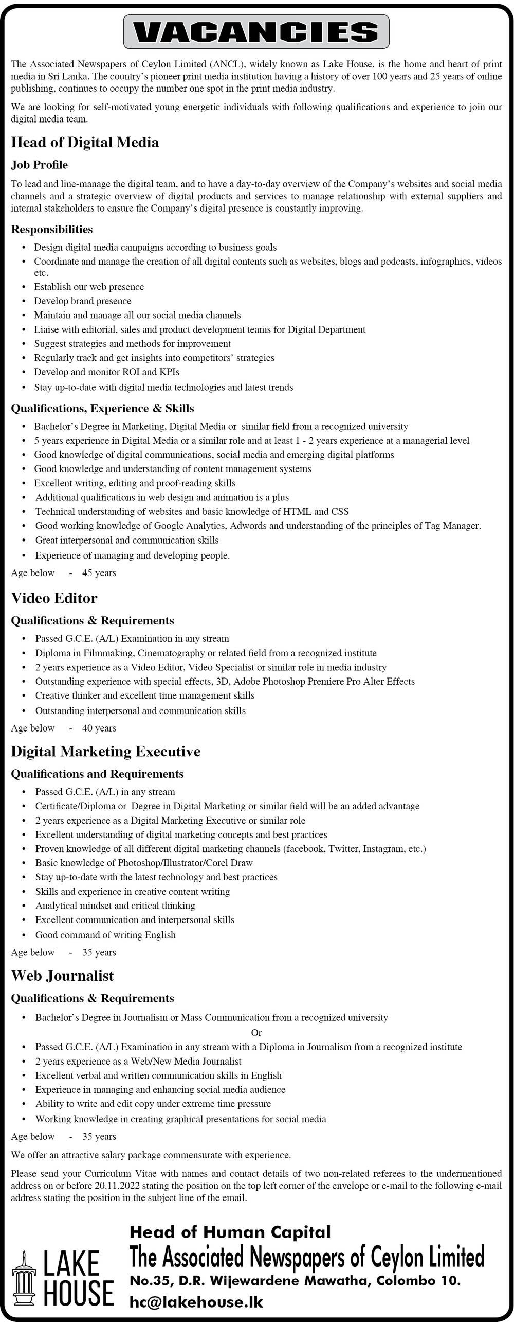 Head of Digital Media, Video Editor, Digital Marketing Executive, Web Journalist - Lake House