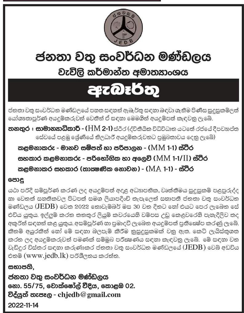 Manager, Assistant Manager, Management Assistant - Janatha Estates Development Board