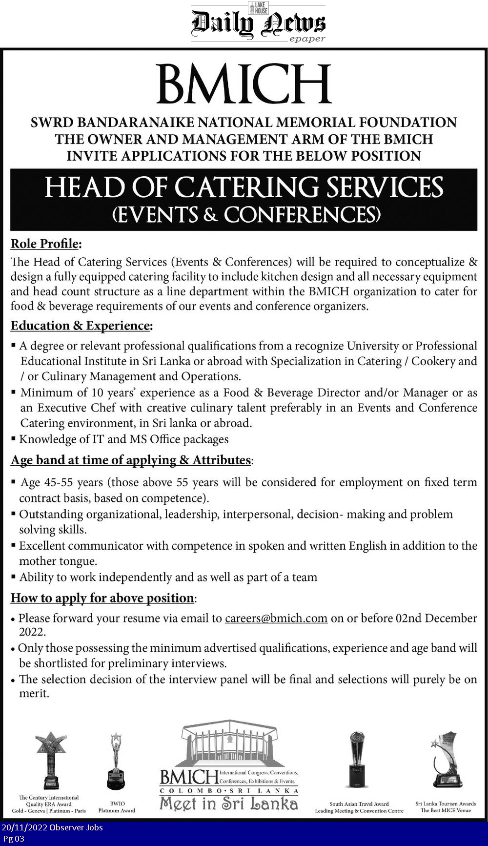 Head of Catering Services - Bandaranaike Memorial International Conference Hall