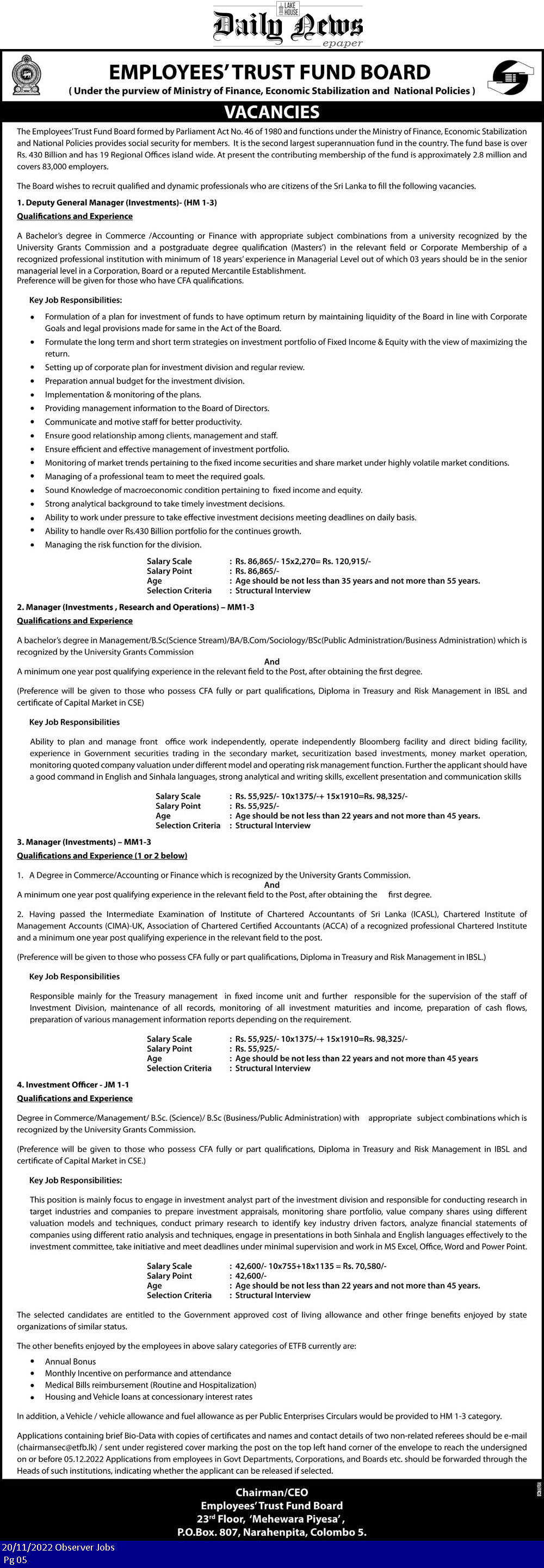 Deputy General Manager, Manager, Investment Officer - Employees Trust Fund Board