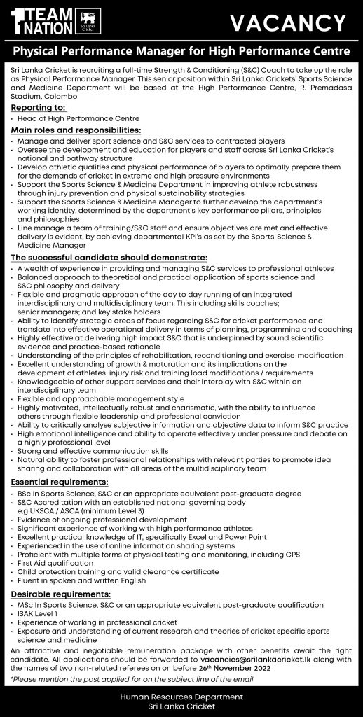 Physical Performance Manager - Sri Lanka Cricket