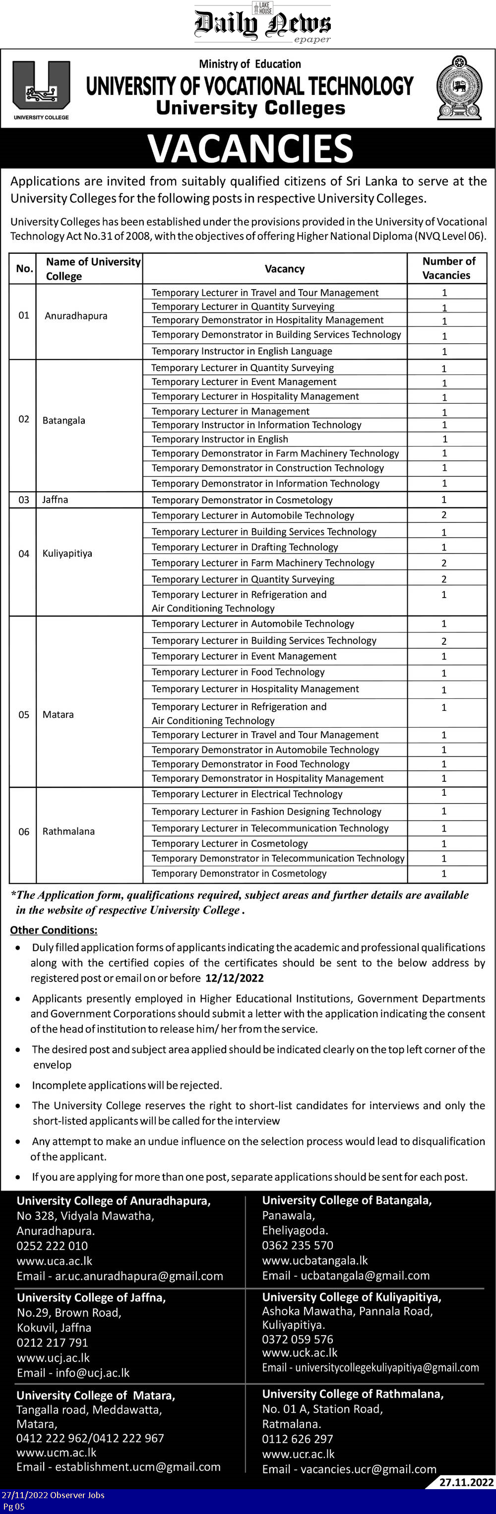Lecturer, Demonstrator, Instructor - University of Vocational Technology