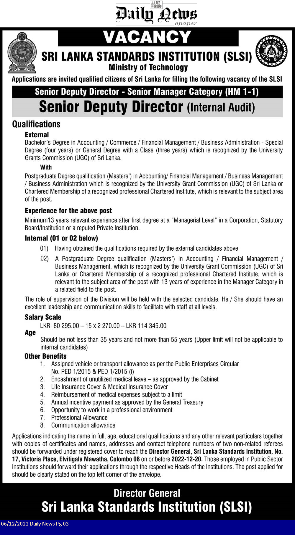 Senior Deputy Director (Internal Auditor) - Sri Lanka Standards Institution