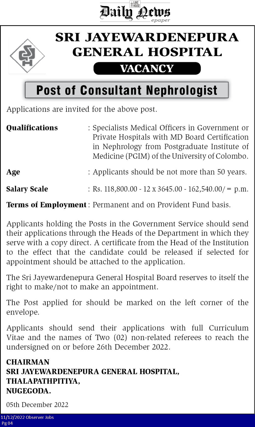 Consultant Nephrologist - Sri Jayewardenapura General Hospital