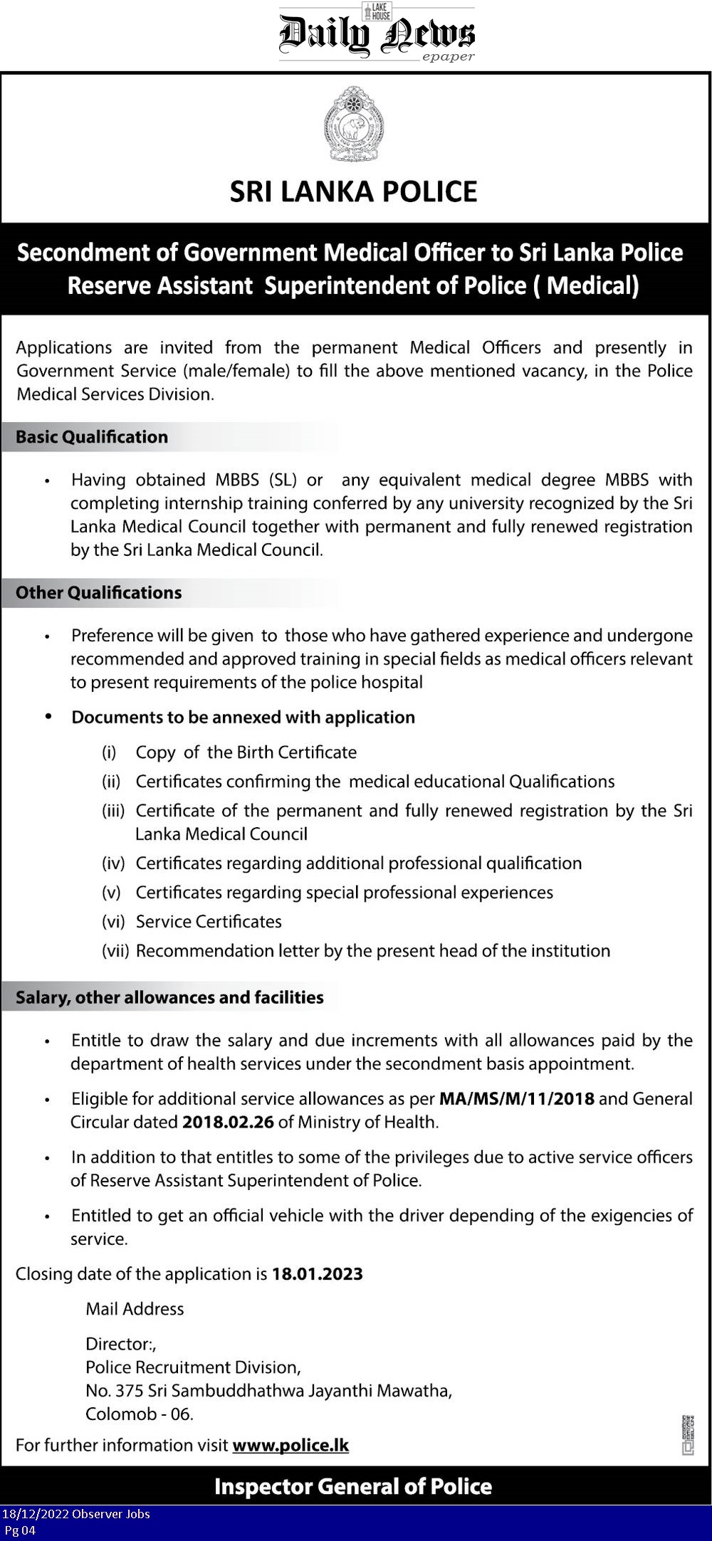 Medical Officer (Assistant Superintendent) - Sri Lanka Police