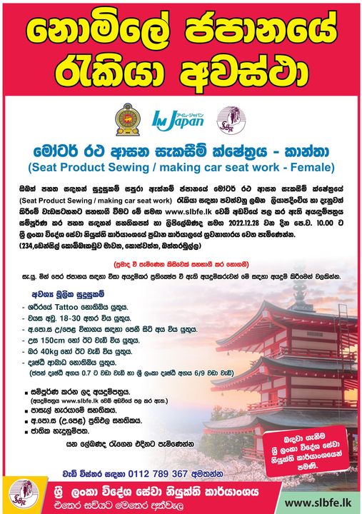 Seat Product Sewing and Making Car Seat Work jobs (Women) - Sri Lanka Bureau of Foreign Employment