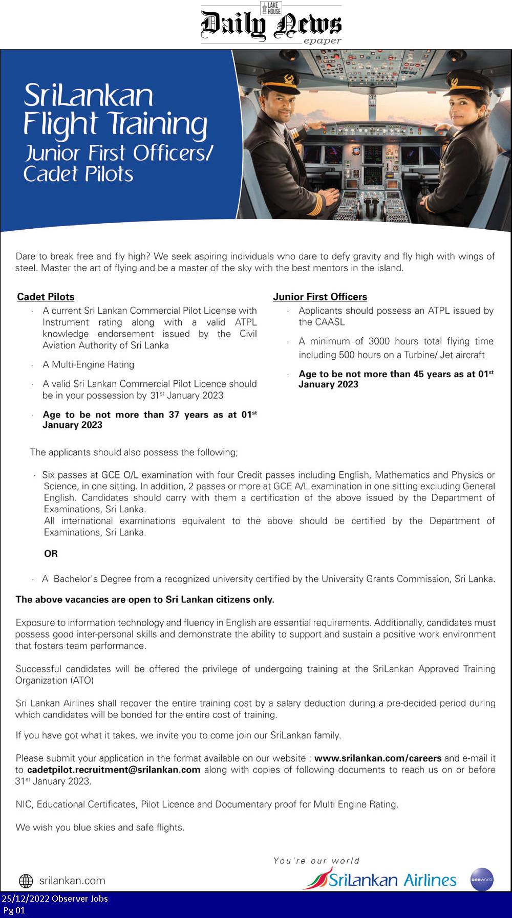 Cadet Pilot, Junior First Officer - SriLankan Airlines