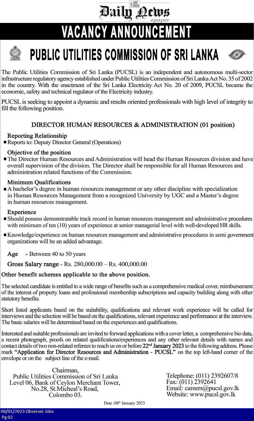 Director (Human Resources & Administration) - Public Utilities Commission of Sri Lanka
