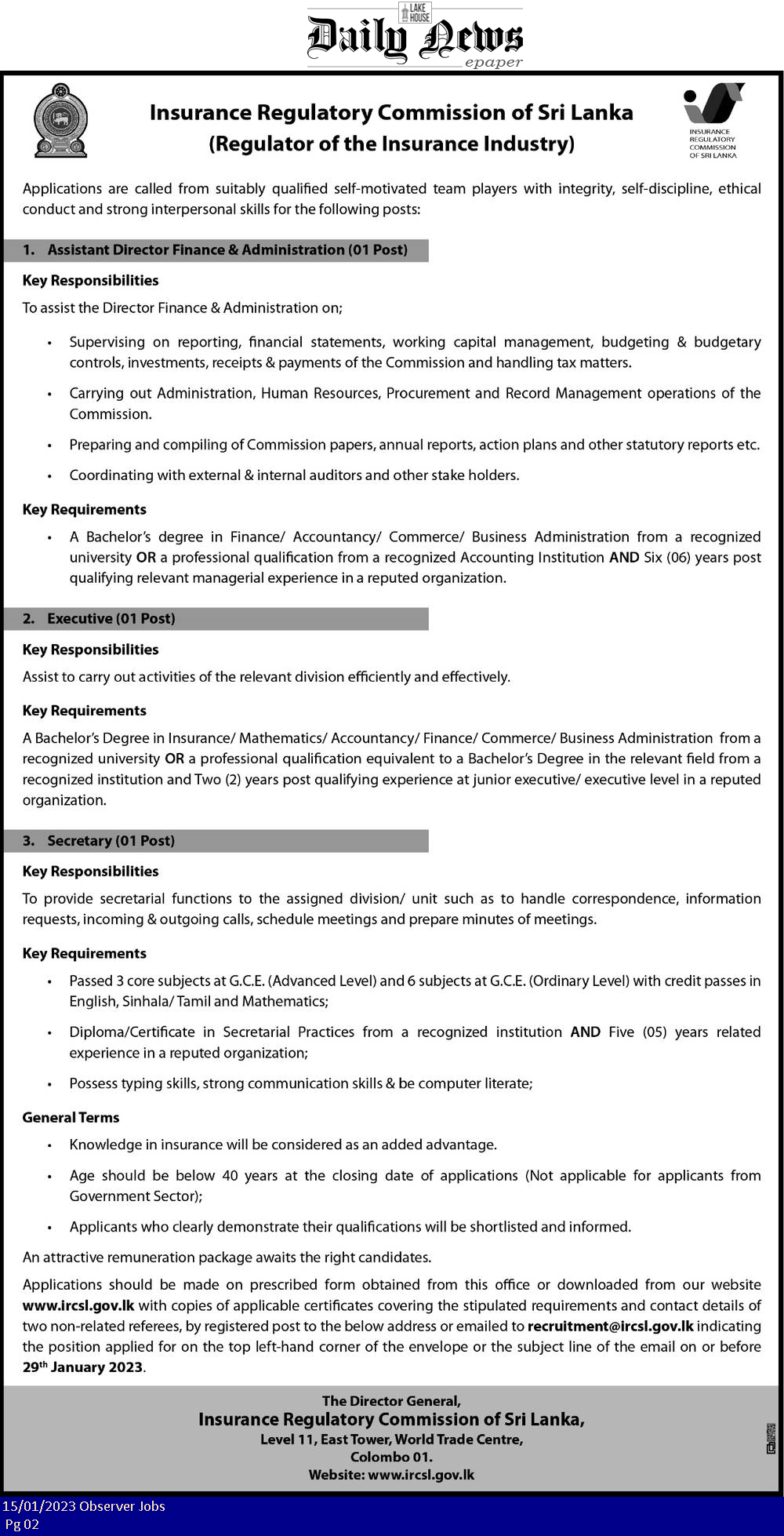 Assistant Director , Executive, Secretary - Insurance Regulatory Commission of Sri Lanka