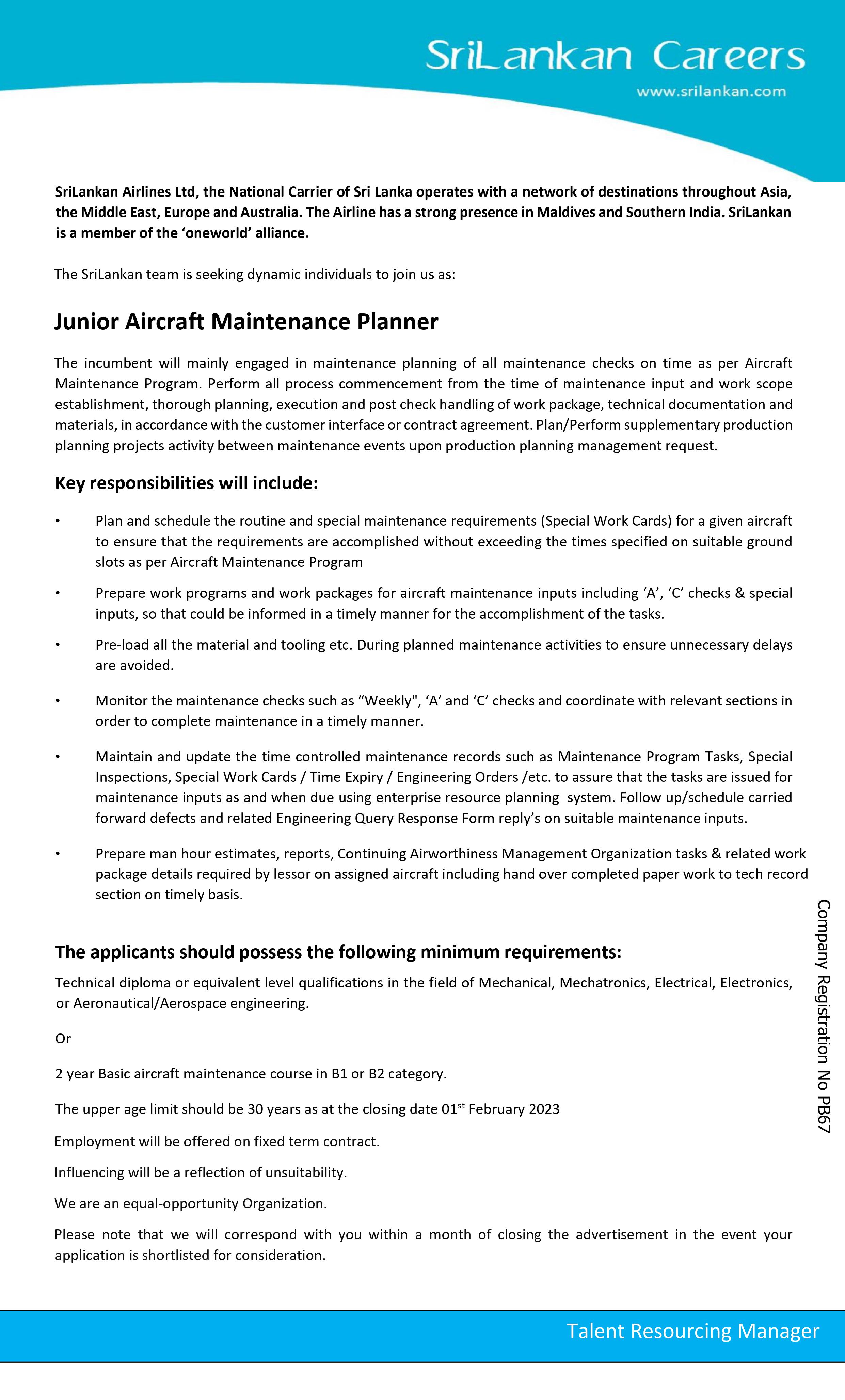 Junior Aircraft Maintenance Planner - SriLankan Airlines