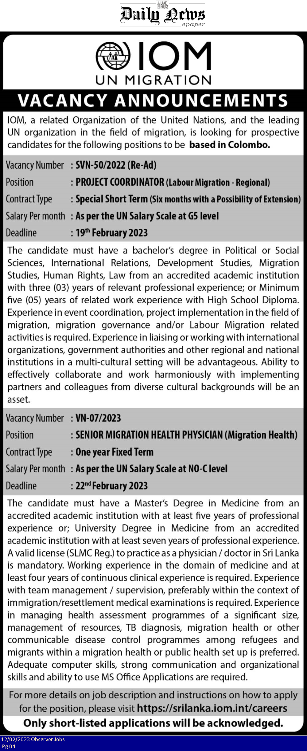 Project Coordinator, Senior Migration Health Physician - International Organization for Migration