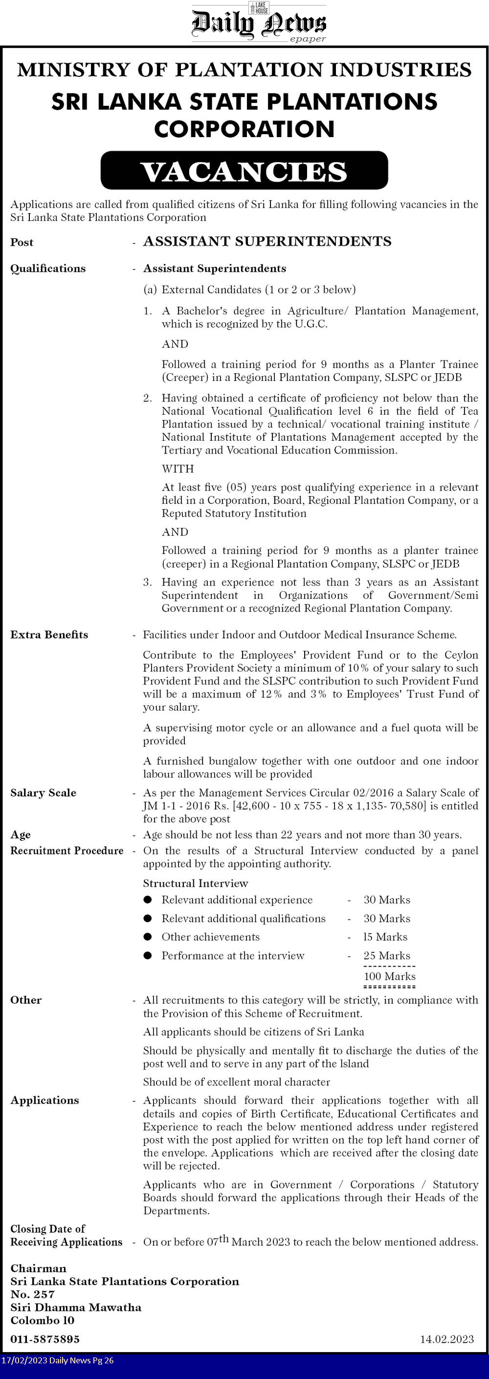 Assistant Superintendent - Sri Lanka Plantations Corporation