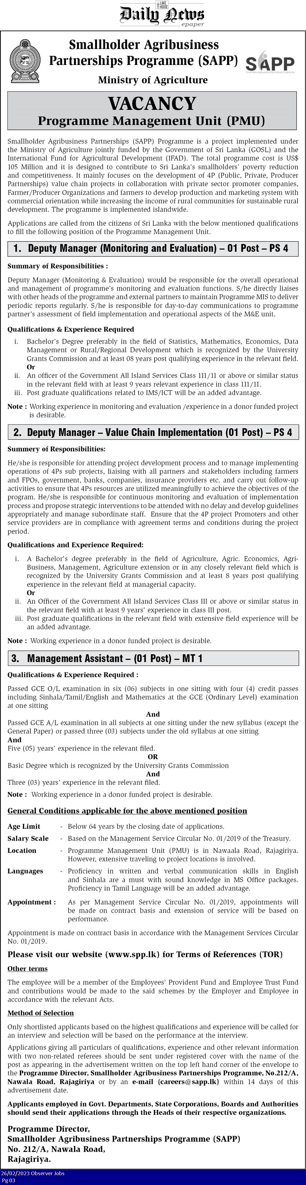 Deputy Manager, Management Assistant - Ministry of Agriculture
