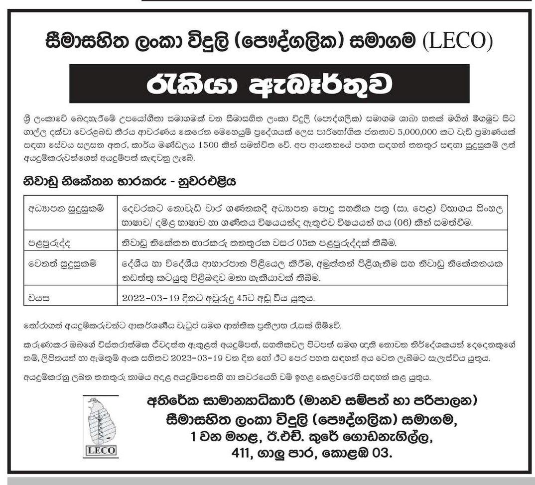 Holiday Bungalow Caretaker - Lanka Electricity Company (Private) Ltd