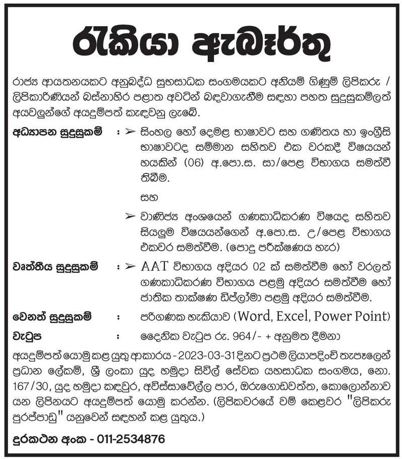 Accounts Clerk - Sri Lanka Army Civilian Benefit Association