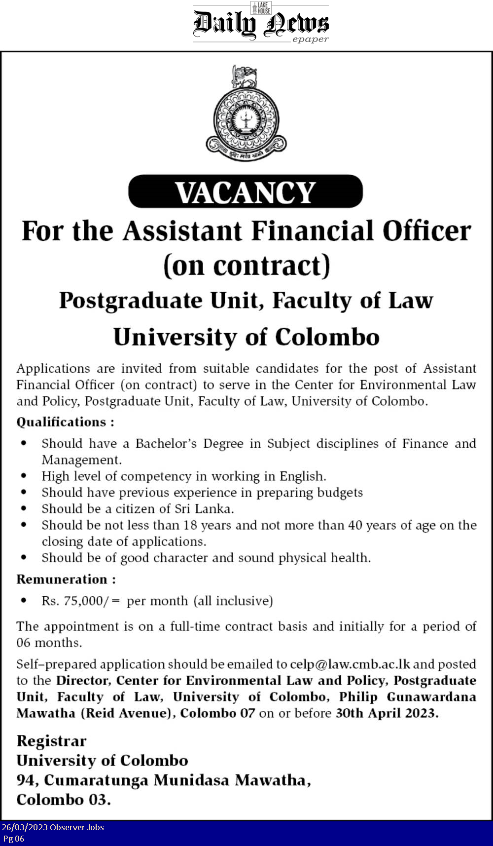 Assistant Financial Officer - University of Colombo