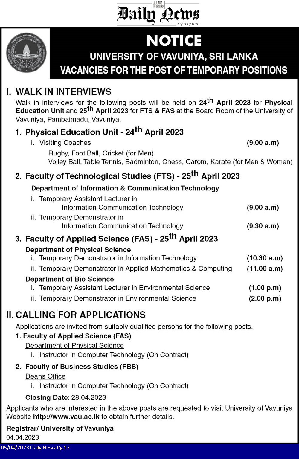 Visiting Coaches, Assistant Lecturer, Demonstrator - University of Vavuniya