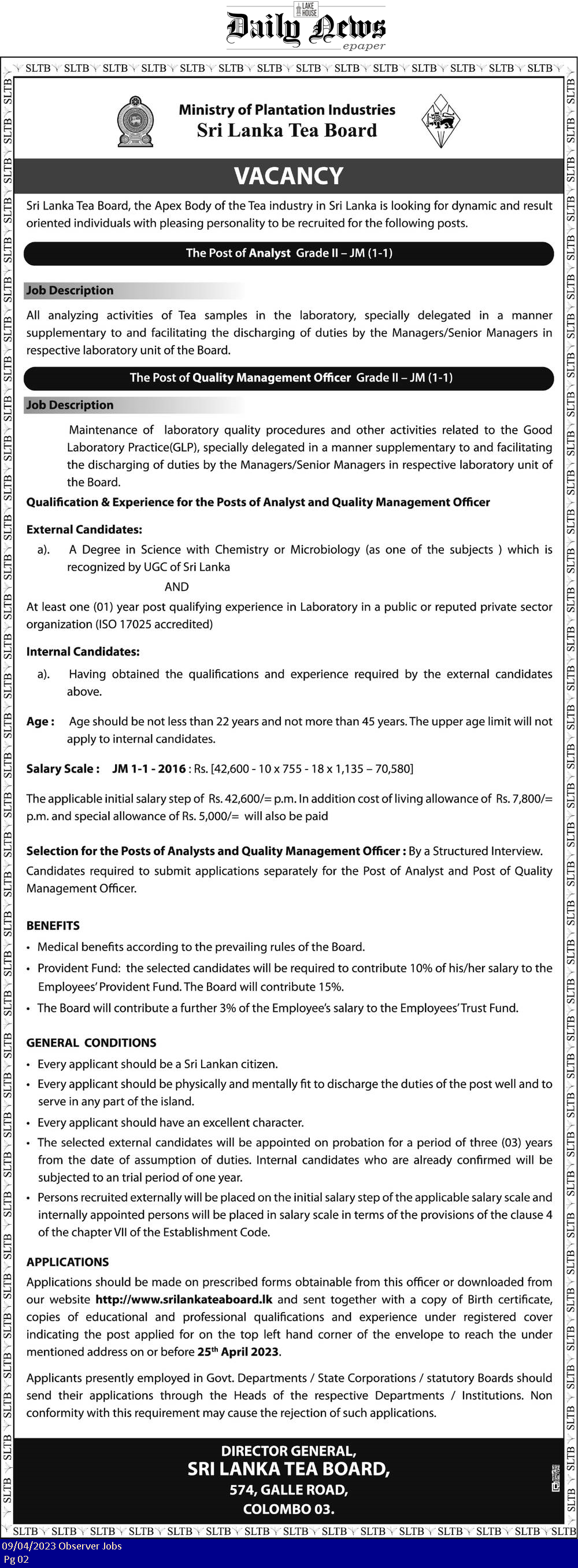 Analyst, Quality Management Officer - Sri Lanka Tea Board