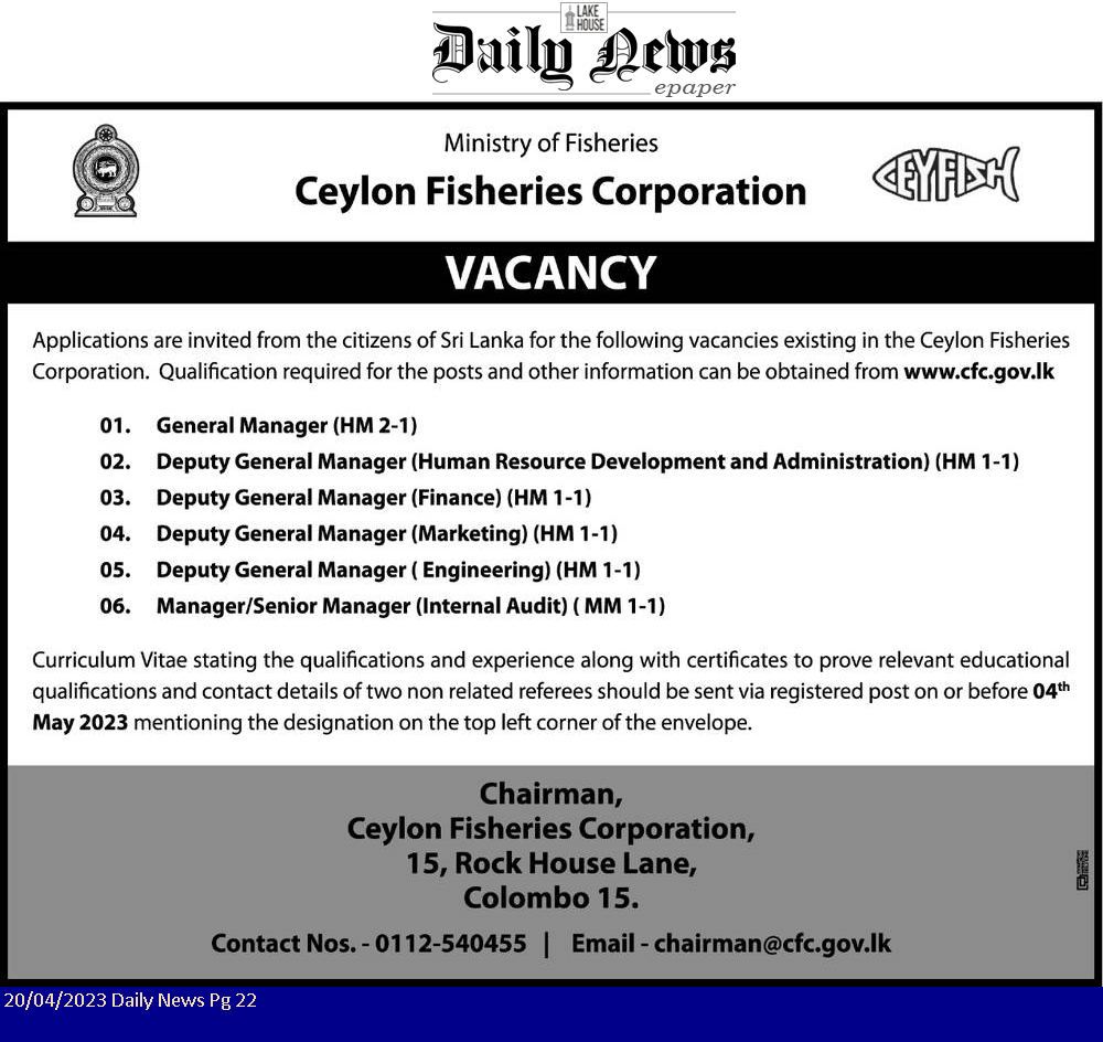 General Manager, Deputy General Manager - Ceylon Fisheries Corporation