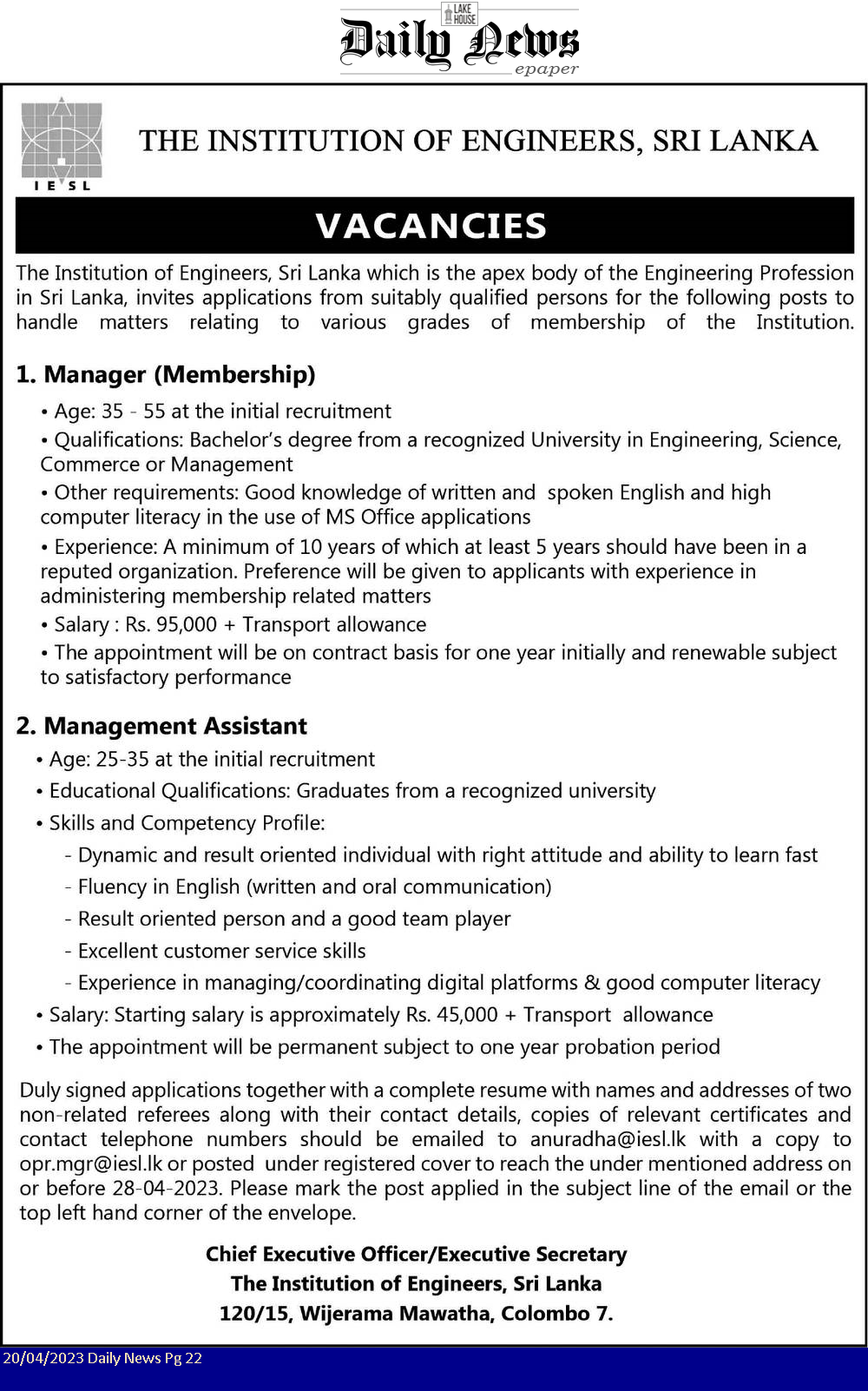 Manager, Management Assistant - The Institution of Engineers Sri Lanka