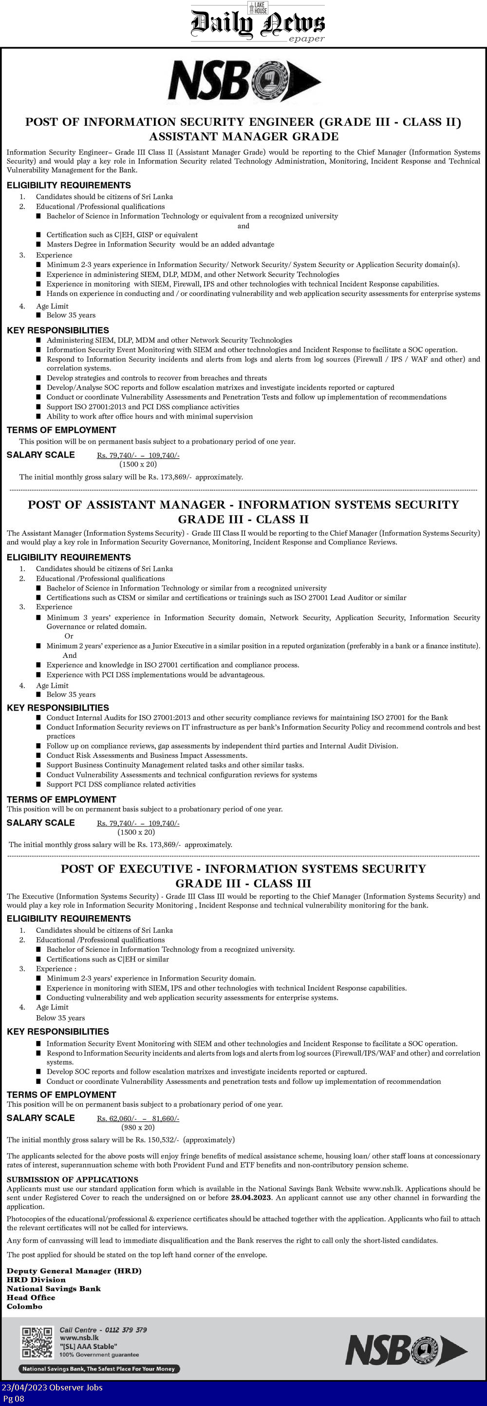 Information Security Engineer, Assistant Manager - National Savings Bank