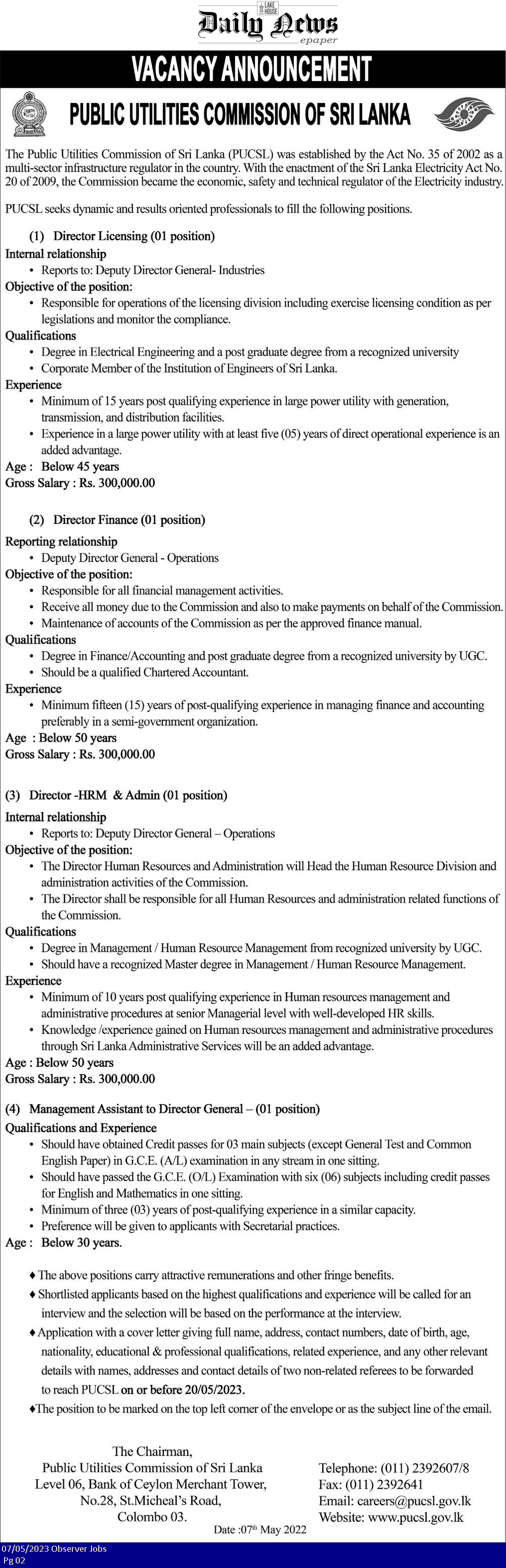 Director, Management Assistant - Public Utilities Commission of Sri Lanka